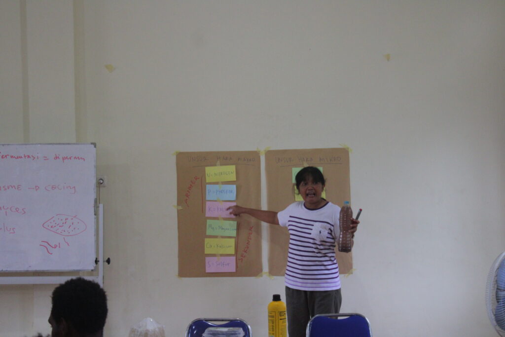 Fasilitator dalam kegiatan ini adalah Ibu Puji Astuti dan Tim dari Politeknik Yasanto, Merauke. Ibu Puji dan tim dari Politeknik Yasanto tidak hanya menyampaikan materi di dalam kelas, tetapi juga memfasilitasi sesi praktek lapangan untuk memastikan pemahaman yang mendalam oleh peserta. Menurut Ibu Puji Astuti bahwa belajar teori di dalam kelas hanya sekitar 30%, selebihnya 70% para peserta langsung praktek di lahan kebun.